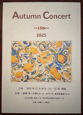 2025年 11月16日に、第15回発表会を行いました。今回は音響の良い原宿ホール60で、より一層素敵な演奏を楽しむことができました。 ...
